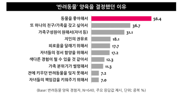 반려동물을 양육해본 경험이 있는 응답자(전체 64%)들은 동물을 좋아하는 마음(56.4%, 중복응답)과 함께 또 하나의 가족과 친구를 갖고 싶다는 바람(36.7%)으로 반려동물의 양육을 결심한 것으로 나타났다. 반려동물에 대한 애정 때문에 양육을 하는 경향은 특히 20대~30대 젊은 층에서 뚜렷했다.